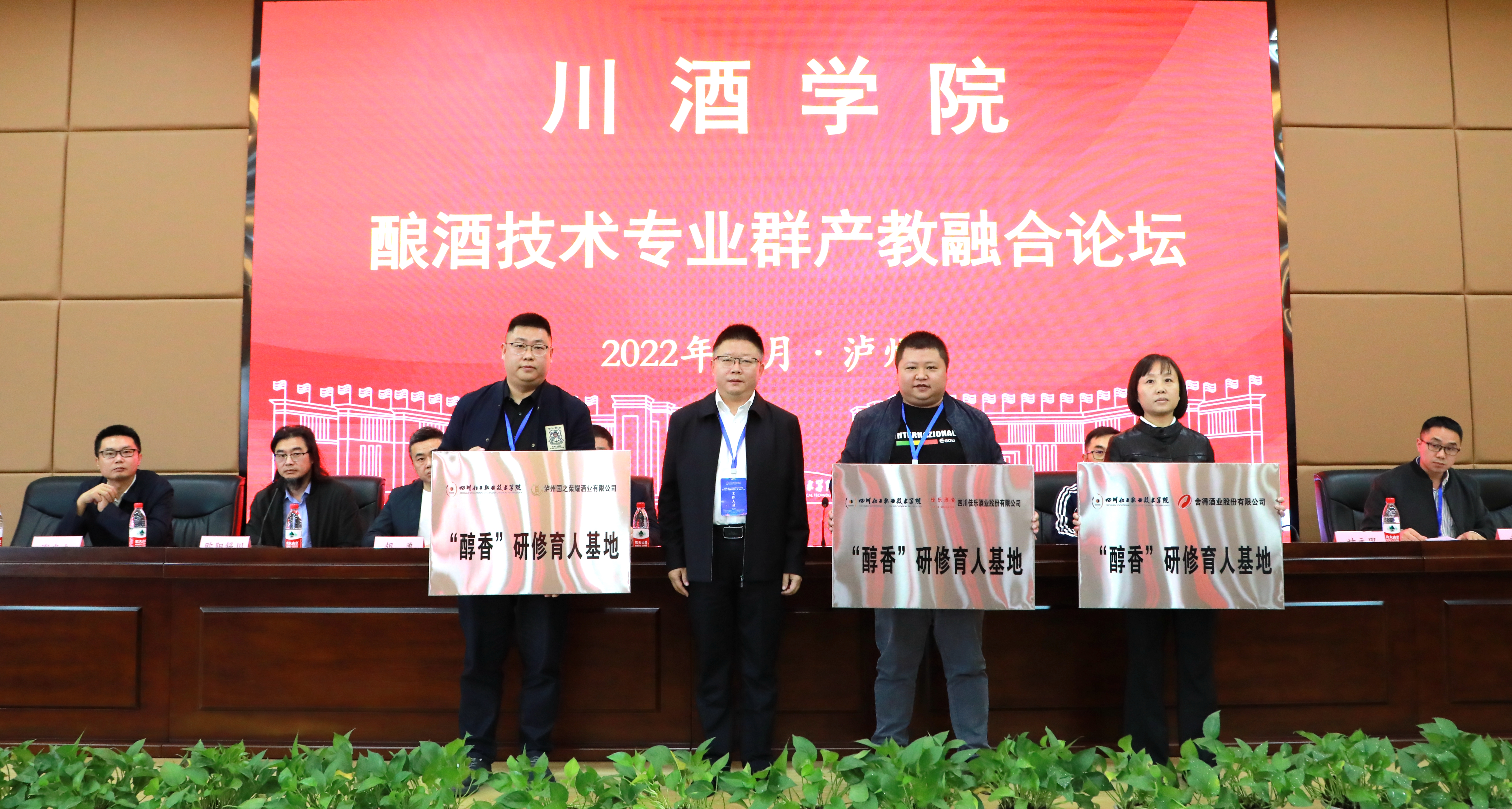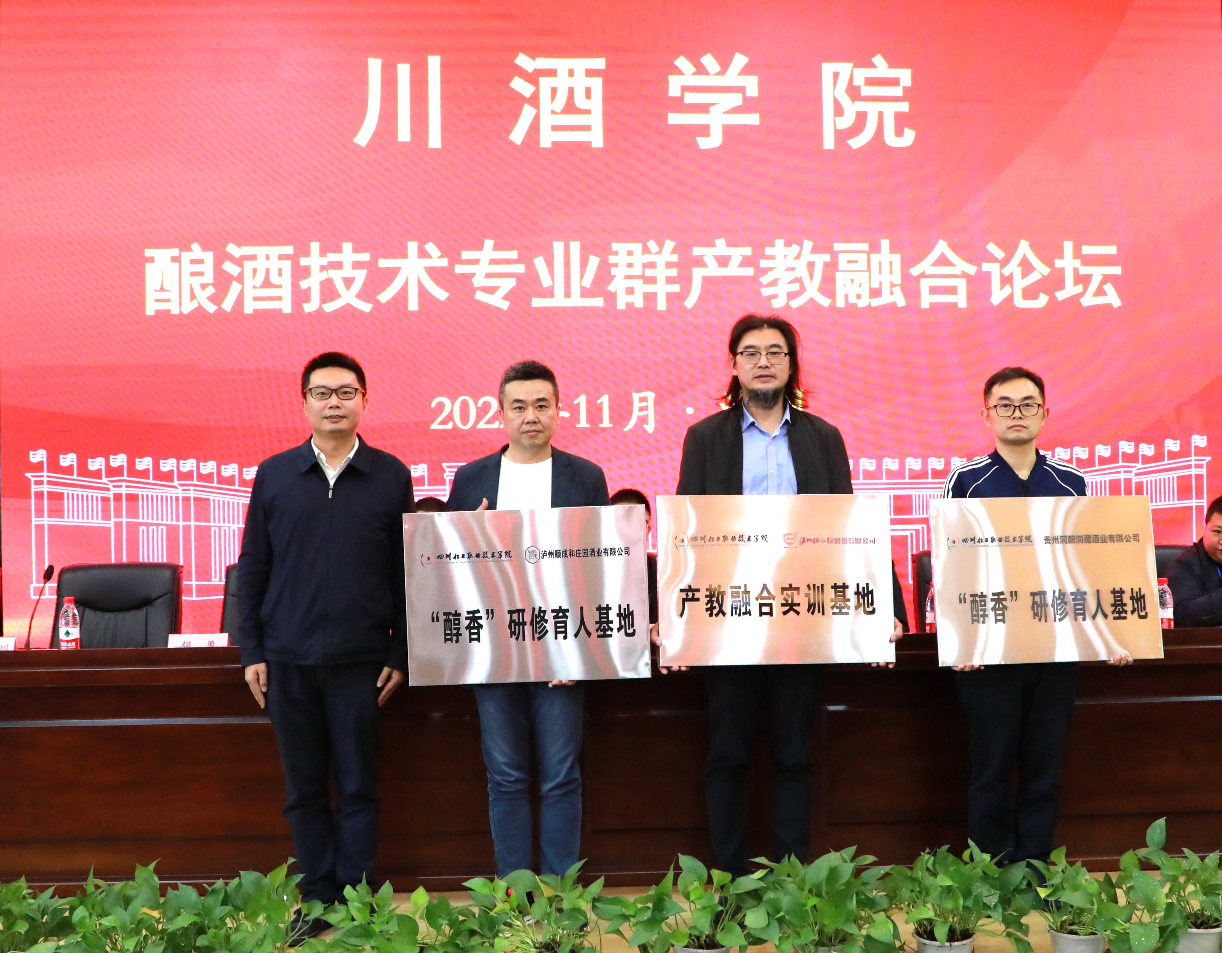 谢光杰代表学校与顺成和、肥儿粉、国之荣耀公司签订了校企合作协议,文申柳、谢光杰分别向产业导师颁发了聘书,并向顺成和庄园、贵州洞酿洞藏酒业有限公司、泸州国之荣耀酒业有限公司颁发了“醇香”研修育人基地牌匾。