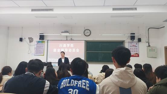 2022年11月18日,川酒学院在勤学楼B403教室召开了2020级毕业生就业指导动员大会。川酒学院直属党支部书记唐德兵向毕业班学生作就业指导动员。川酒学院学生科长王家艳参加了就业指导动员会。