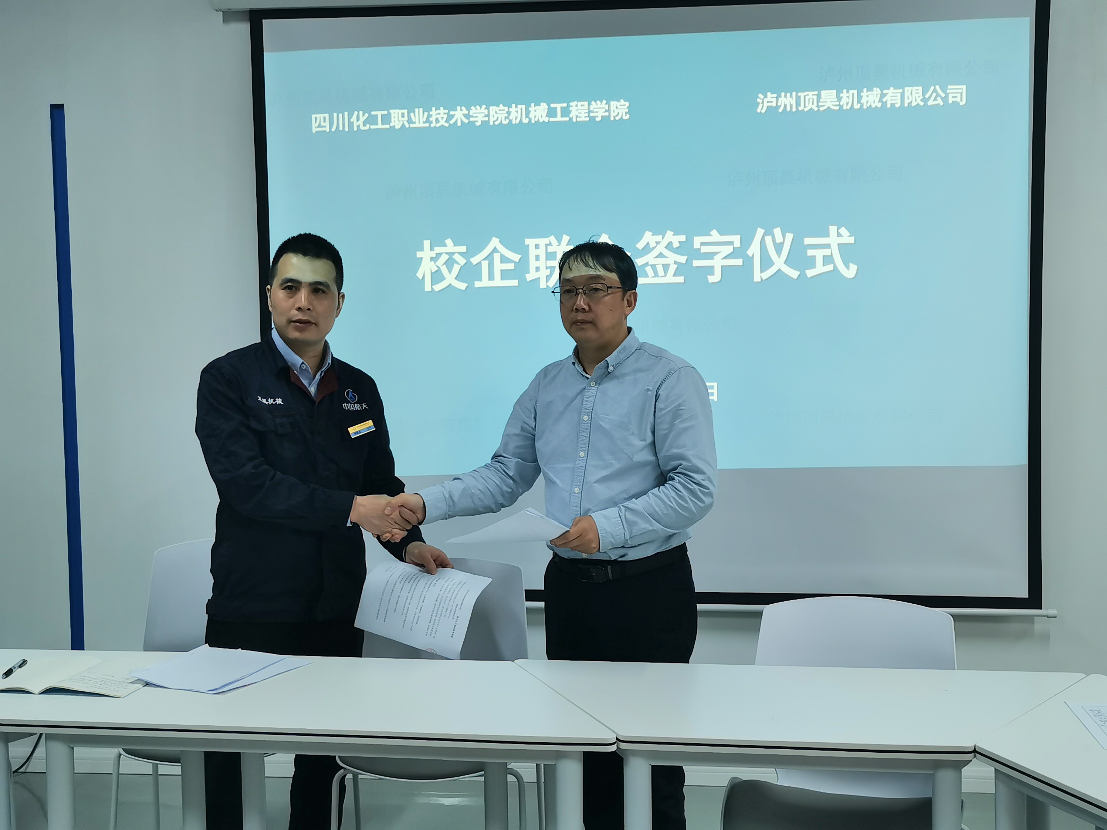为深化产教融合、校企合作,同时为企业培养更多高素质技术技能人才,共求发展机遇,10月20日,机械工程学院与泸州航天产业联盟的泸州顶昊机械有限公司(后称顶昊机械)达成合作共识,并举行了校企合作签约授牌仪式。机械工程学院院长任小鸿、副院长陈玲、机械教研室主任梅静、工程实训中心主任赵波、专任教师吴胜,顶昊机械总经理刘成仓、党支部书记刘登华、副总经理刘文彬、车间主任潘飞参加签约仪式。