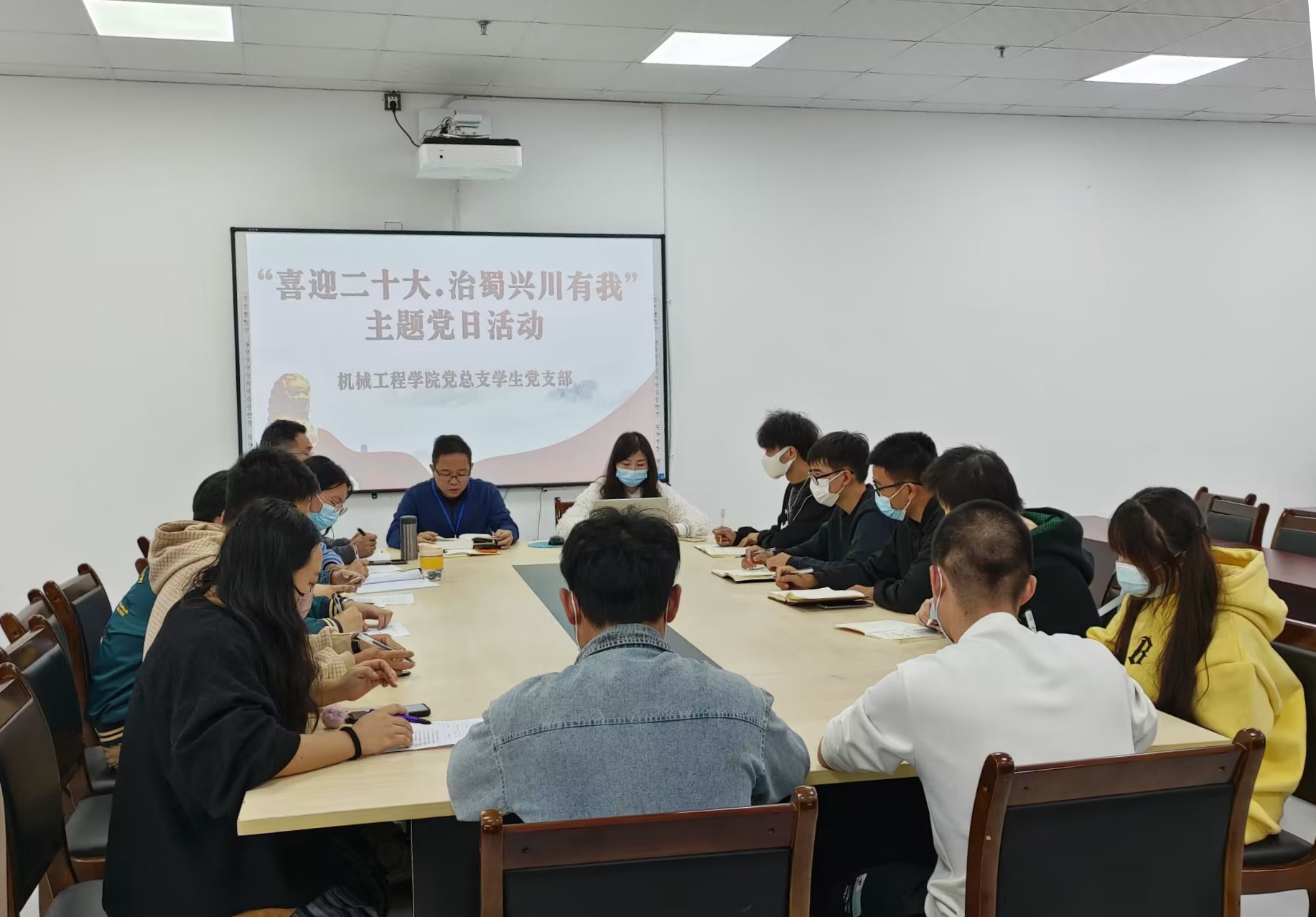 为喜迎党的二十大胜利召开,机械工程学院党总支教师党支部和学生党支部于10月12日分别组织召开了“喜迎二十大 治蜀兴川有我”主题党日活动。学校党委副书记、院长文申柳,机械工程学院党总支副书记、院长任小鸿,学生党支部书记、副院长张良勇,全体党员同志、入党积极分子、学生代表参加活动。