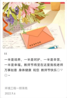 由于当前新冠肺炎疫情形势复杂的原因,今年秋季开学的2022级新生还未到校报到、上课,也无法与老师面对面谈心、交流。在此,药品与环境工程学院2022级新同学为全校教师送上最真挚的祝福: