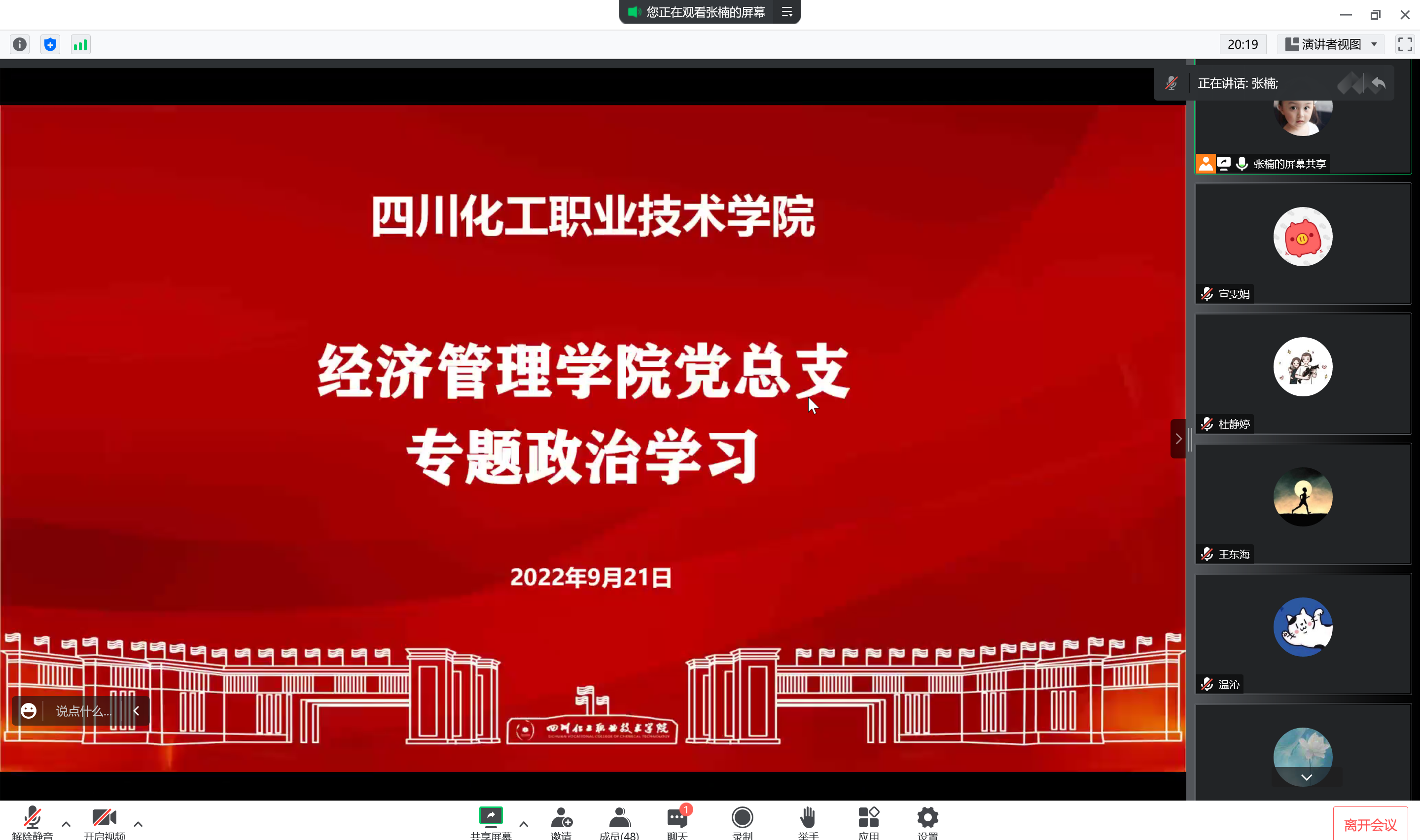 经济管理学院教师党支部书记张楠就文中提到的金句,结合自身党员教师身份谈到,党的十九大以来的五年极不寻常、极不平凡,特别是面对突如其来的新冠肺炎疫情,在抗疫中展现出来的中国共产党的领导力,党员的先进性等是高校教师在课堂上可运用的宝贵的思政素材,并与参会教师交流了进行课程思政的实践体会。