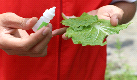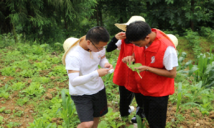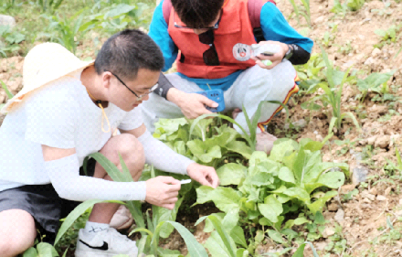 实践队员利用食用农药速测卡进行检测农药残留是否合格,农药速测卡中含有对农药高度敏感的生物活性蛋白(胰腺碱酯酶),能够快速检测蔬菜中有机磷和氨基甲酸酯类农药残留情况,该方法具有操作简便、快速有效、结果可靠、携带方便等优势。实践团队前往村民的菜地分别对白菜、生菜、包菜、莴笋等取样进行农药残留检测,经检测,所有取样菜品均符合食品卫生标准。村民们大多凭借多年的耕种经验来控制农药剂量的使用。如今人们生活水平不断提高,他们也希望学习到更多科学性的知识指导自身开展农业种植,菜吃得放心,农药用得安心。