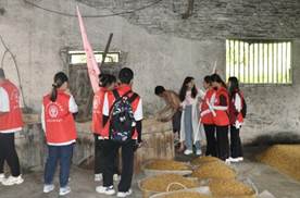 老虎埂酒厂、鸿吉酒厂、佳诚酒厂等酒厂负责人向团队成员热情讲解了粮食酒的酿造工艺,团队成员也品尝了当地的高粱酿造白酒,同学们通过调研得知,当地白酒生产的主要原料为高粱、玉米。在金榜村种植的粮食也几乎以高粱、玉米为主。金榜村的大小酒厂通过发展酿酒产业,增加了农产品附加值,拉动了乡村经济的发展,同时为当前农民卖粮难、收入少、粮食储备困难等实际问题提供了新的出路。目前,村子的酒厂机械化程度整体较低,酿酒的各工艺流程几乎都是人工及半人工操作,急需自动化生产线的投入使用,来拉动生产水平的整体上升。