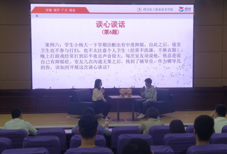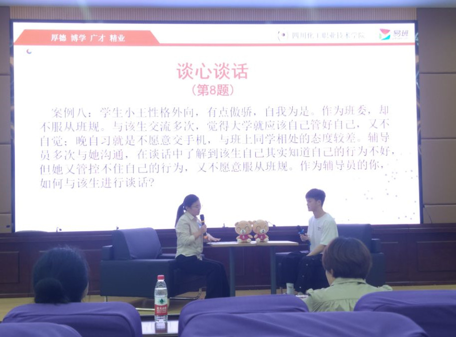 大赛聘请了校外专家和四川省辅导员素质能力大赛获奖选手担任评委,来自学校7个二级学院的14名辅导员参加比赛。大赛分为谈心谈话和案例研讨两个环节,分别以情景再现和你问我答的方式进行,题目涉及思想教育、党团建设、心理健康、日常管理等与学生成长密切相关的问题,主要考察辅导员对学生特征、学生成长成才规律的把握程度,对学生教育引导和解决实际问题的能力,以及对当前高校思想政治工作中的热点、难点问题辨析应对能力。现场气氛热烈,充分展现了辅导员们准确把握政策法规、拥有扎实的理论功底和专业素养以及良好交流沟通能力。