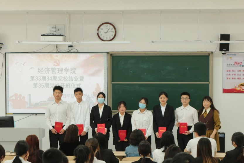2022年5月16日,经济管理学院业余党校第33、34期结业仪式暨第35期开班仪式在勤学楼A205教室召开。经济管理学院党总支书记张晋老师、学生党支部书记李诗诗老师、学生科长张婷老师、教师党支部组织员王东海老师、纪检委员谢耀辉老师以及学生党支部宣传委员杜燕老师参加活动。