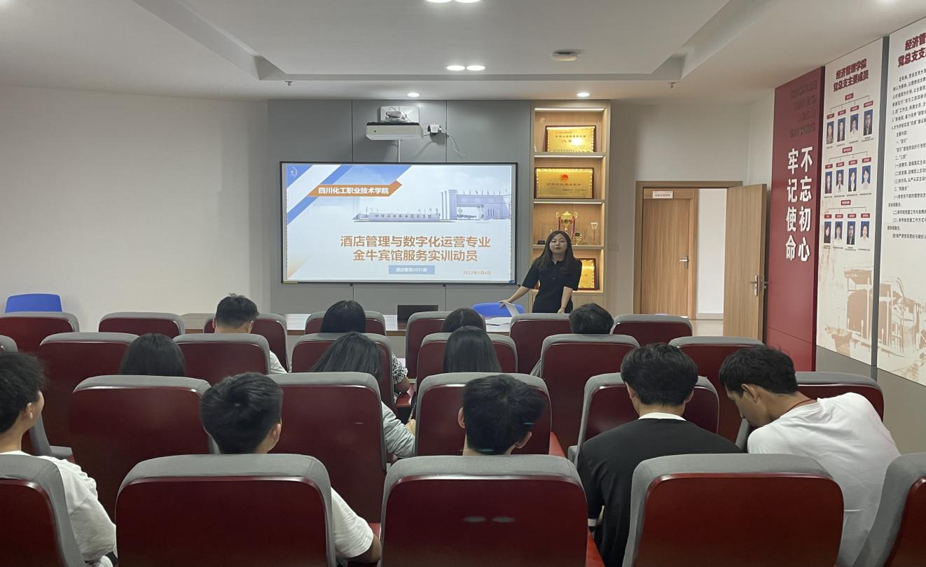 5月5日,经济管理学院酒店管理与数字化运营专业20级12名学生前往四川省人民政府金牛宾馆参加岗位实训。出发前一天, 经济管理学院组织开展了岗位实训暨安全教育动员大会。实习指导教师讲解了实训任务,对实训期间的班级安全管理提出了要求,特别强调了注意疫情防控安全,希望同学们在实训过程中严格遵守实习单位的规章制度、加强专业技能的学习,积极主动参与实训,展现化院学子的精神风貌。