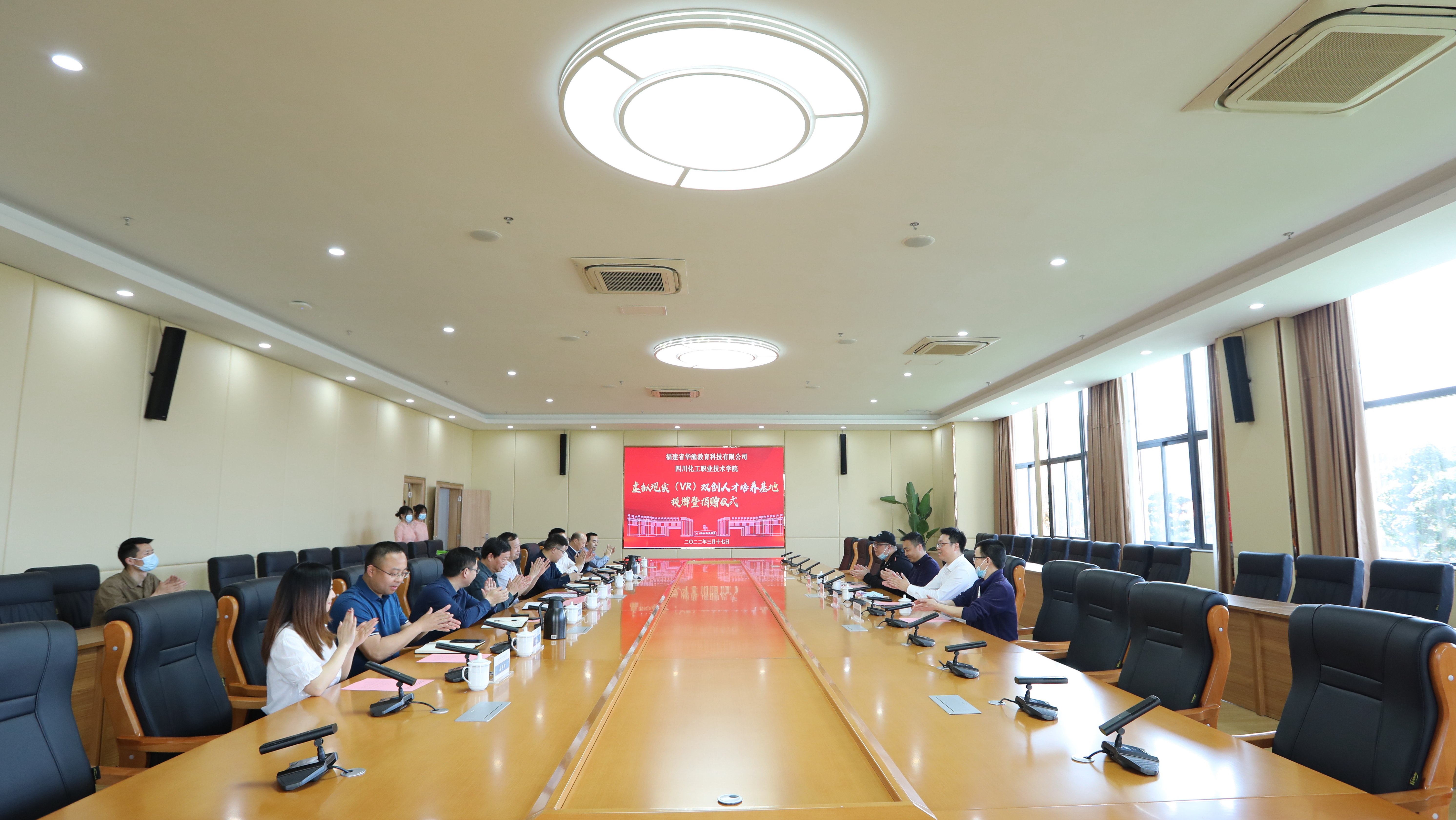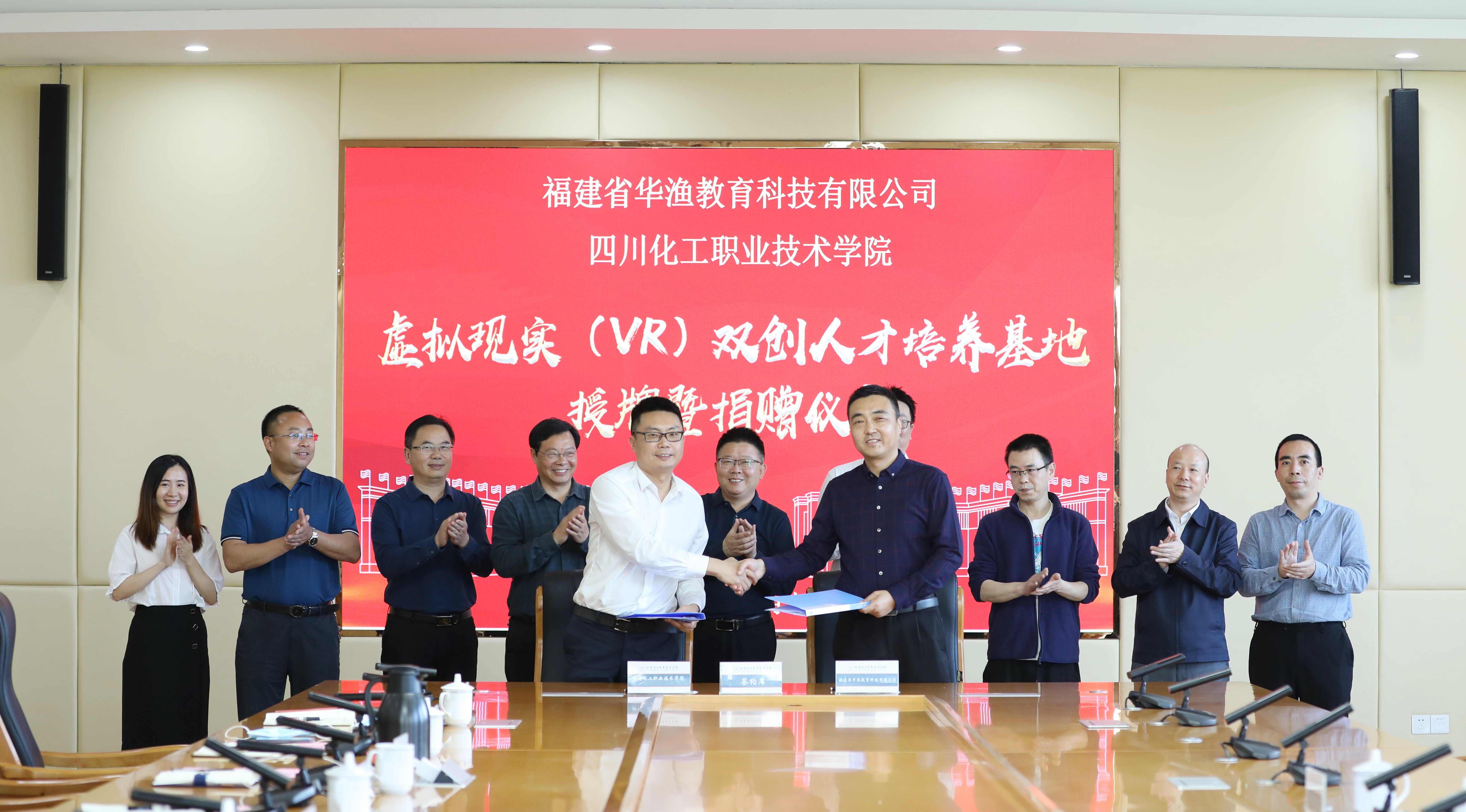 在与会人员的见证下,马文君代表华渔教育授予四川化工职业技术学院“虚拟现实(VR)双创人才培养基地”,并与谢光杰共同签署价值20万元的软硬件及资源捐赠协议,文申柳向华渔教育颁发了爱心企业牌匾。