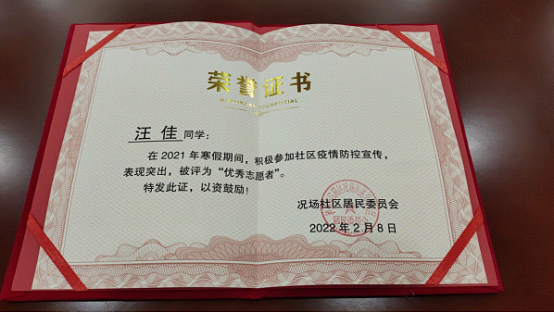 食品检测2132班汪佳,在况场社区街道对群众进行扫场所码宣传,对返乡人员进行摸排检查;协助报备人员进行扫码;整理返乡人员的核酸报告,进行分类排序;记录中高风险地区返乡人员14天体温并登计在册。
