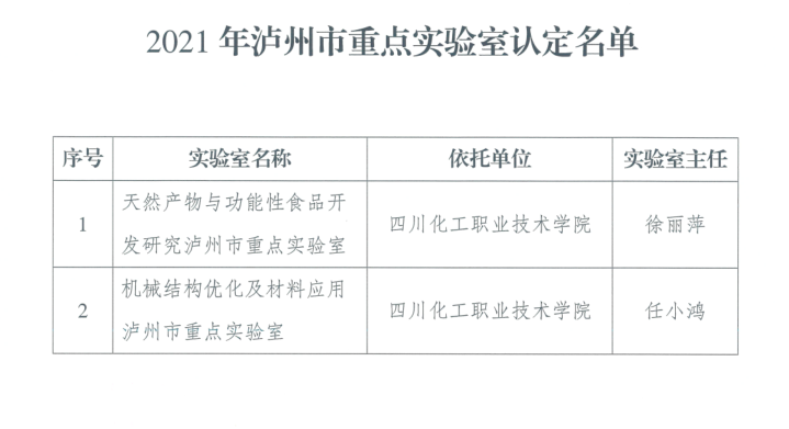 2021年11月23日,根据泸州市科学技术和人才工作局《关于认定天然产物与功能性食品开发研究泸州市重点实验室等2个市重点实验室的通知》获悉,由四川化工职业技术学院机械工程学院组建的机械结构优化及材料应用泸州市重点实验室获批成立。