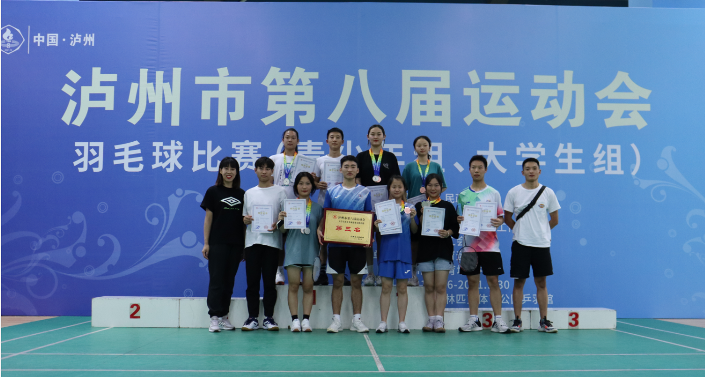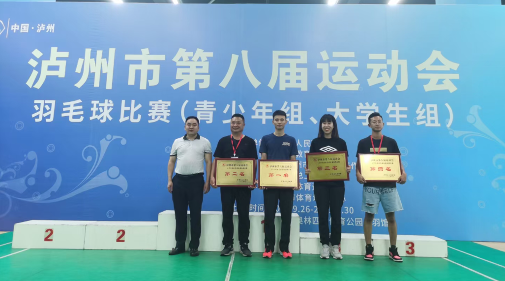 9月27日至30日,由泸州市人民政府主办的泸州市第八届运动会大学生组羽毛球比赛在泸州市奥体公园羽毛球馆举行。学校黄亚乔和郭平老师带队,组织学生参加了男团、女团、男单、女单、男双、女双、混双项目的比赛。