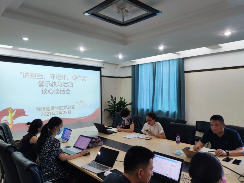 为深入贯彻落实学校警示教育月活动实施方案,增强党总支凝聚力,提升党员干部素养。7月28日下午,经济管理学院党总支在行政楼404办公室,结合网络会议平台在线上和线下开展了“讲担当、守纪律、促作为"警示教育活动谈心谈话会。
