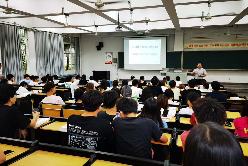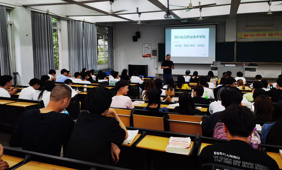 四川化工职业技术学院和成都百都科技有限公司合作的“百度订单班”开展三年来,共培养了近百名同学,近40名同学签订了就业协议。本次订单班宣导会主要目的是引入企业专家为19级同学提前开展就业辅导。宣导会上,来自成都百都科技有限公司的HRBP渠道部高级总监张保刚为同学们讲解了大学生的就业心态调整、公司的企业文化、岗位晋升渠道等内容,鼓励大家积极提升自己的核心竞争力,探寻自己喜欢和适合的工作岗位。