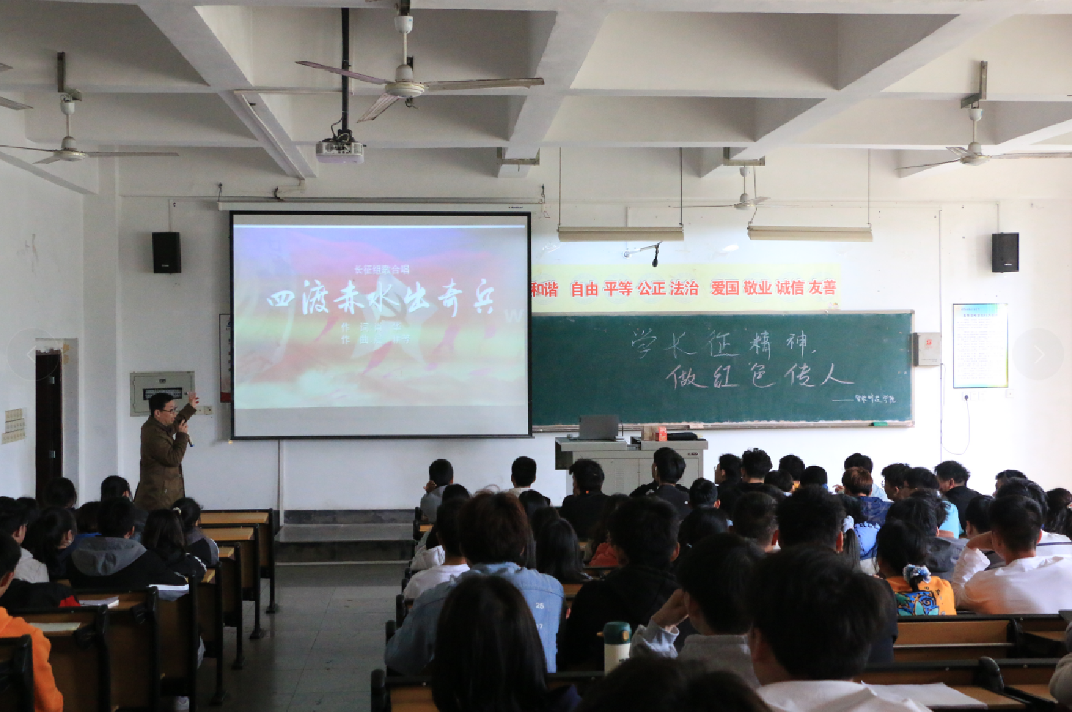 彭毅还用著名的“四渡赤水”战役向同学们讲述了共产党早期艰难的发展过程,分析了四渡赤水取得成功的原因和意义,最后,大家在《七律长征》的诗词歌唱中结束了讲座。