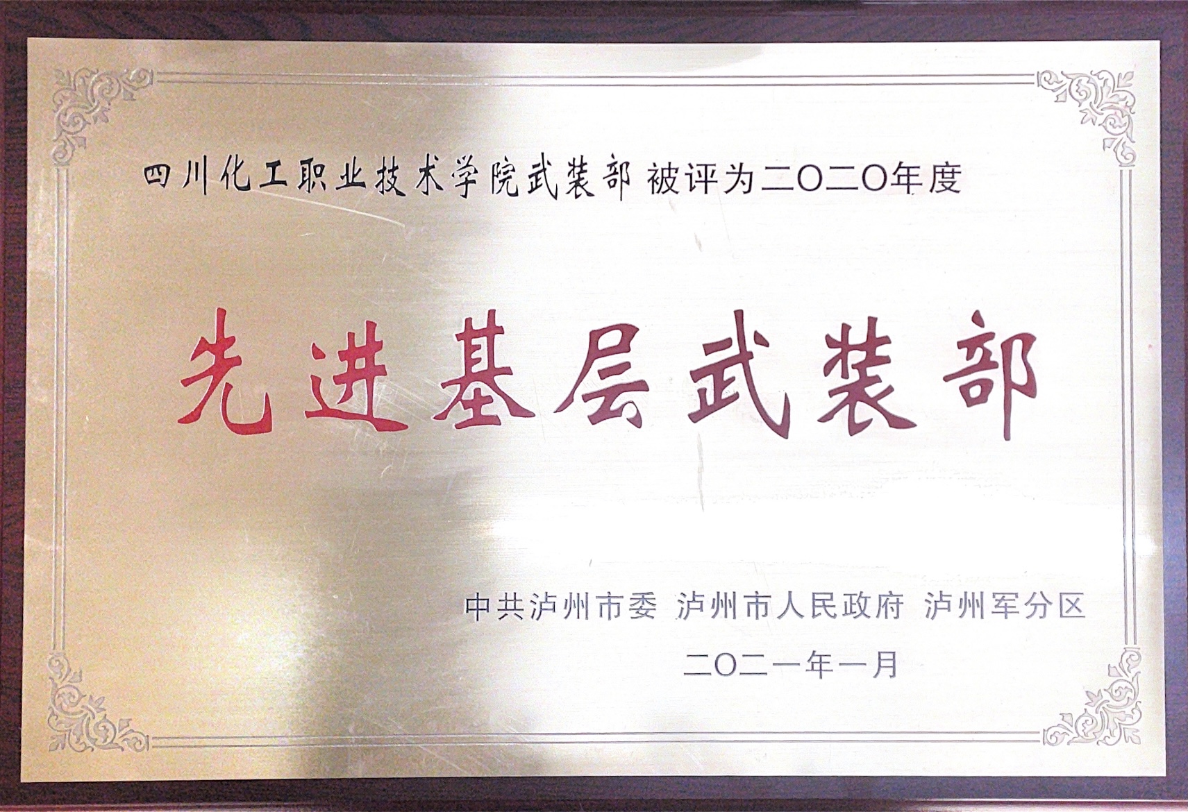 1月14日,泸州军分区党委召开八届五次全体(扩大)会议暨党管武装工作述职会议,宣布《中共泸州市委、泸州市人民政府、泸州军分区关于表彰国防后备力量建设先进单位和先进个人的决定》,并对获奖单位和个人进行表彰。学校武装部荣获“先进基层武装部”荣誉称号。