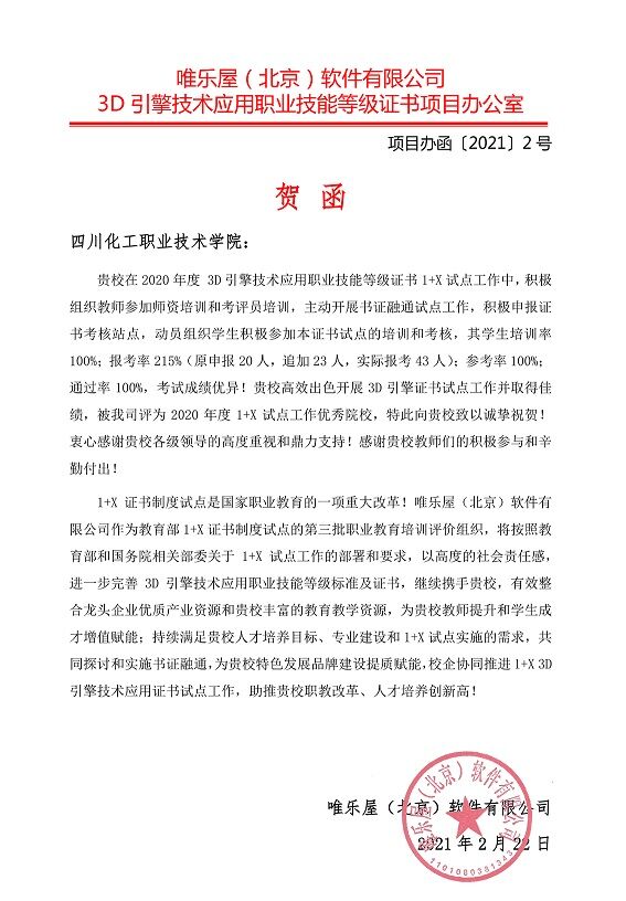 为进一步深化复合型技术技能人才培养培训模式改革,贯彻落实《国家职业教育改革实施方案》,主动参与1+X制度实施工作。2020年,学校数字经济学院虚拟现实专业积极投身 3D 引擎技术应用职业技能等级证书 1+X 试点工作中。他们主动作为,组织教师参加师资培训和考评员培训、主动开展书证融通试点工作、积极申报证书考核站点、动员组织学生积极参加本证书试点的培训和考核,学生培训率100%;报考率215%(原申报20人,追加23人,实际报考43人);参考率100%;通过率100%,考试成绩优异。被1+X技能等级证书培训评价组织评为 2020 年度 1+X 试点工作优秀院校!