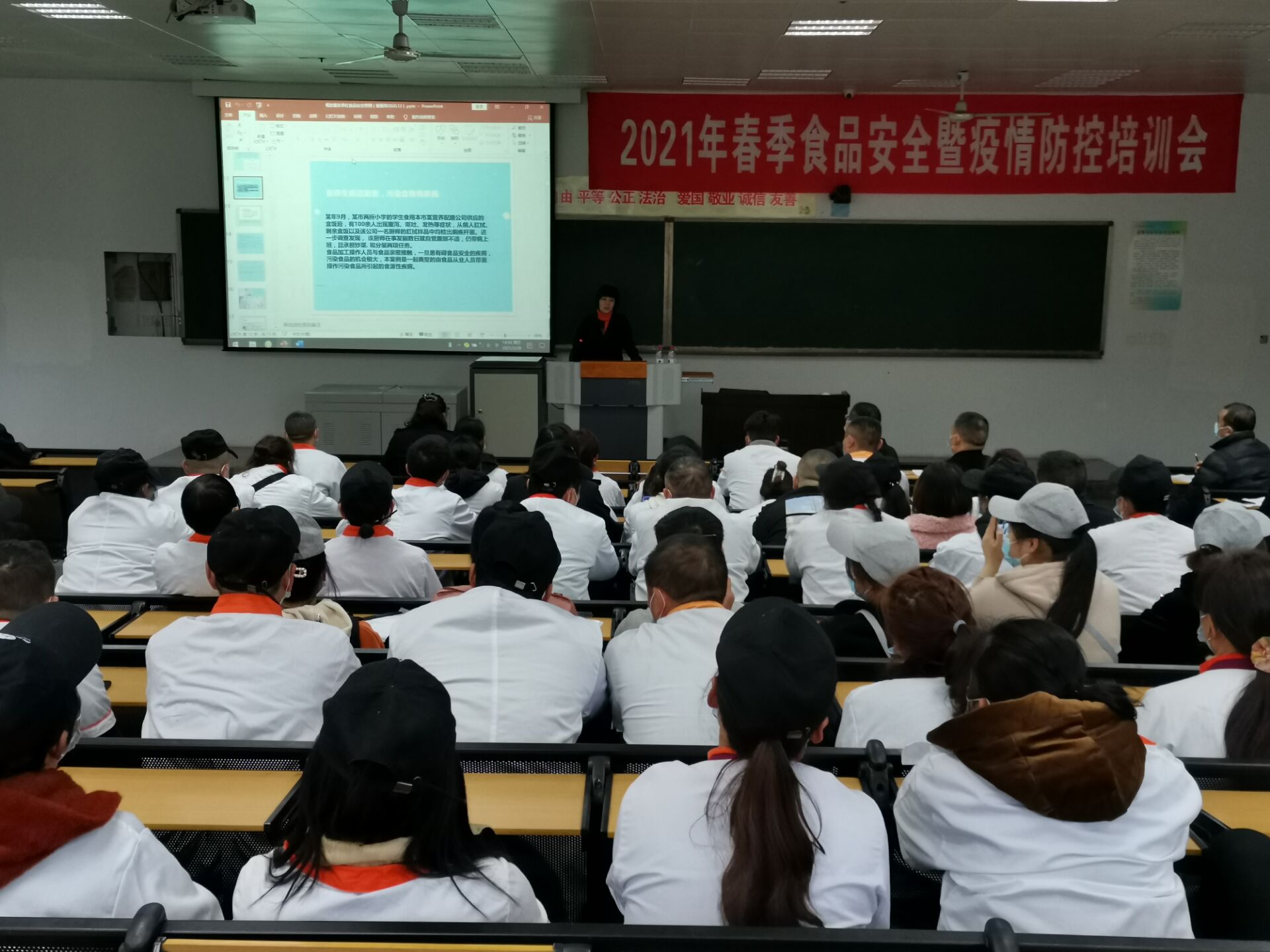 为认真贯彻执行《食品安全法》、《学校食品安全与营养健康管理规定》等相关法律法规以及食品安全知识,学校后勤服务处于2021年2月28日下午在综合实训楼A区208室举行2021年春季食品安全暨疫情防控知识培训大会。培训会由后勤服务处刘真如处长主持,邀请泸州市江阳区市场监督管理局餐饮股谢丽萍股长主讲,属地华阳市场监管所邓艳副所长、后勤生活中心负责人、综合办公室负责人,各食堂管理人员以及食堂从业人员,共计147人参加了培训会。