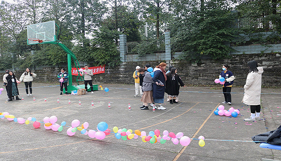 活动正式开始,活动项目丰富多彩:踩气球、双人夹气球、转10圈、指压板连续跳绳、我比你猜、套圈、抢凳子、两人三足等项目,迎来了众多同学的参与,各个游戏区域都有不少同学排队等待,现场秩序井然有序。整个篮球场都洋溢着同学们的欢声笑语。