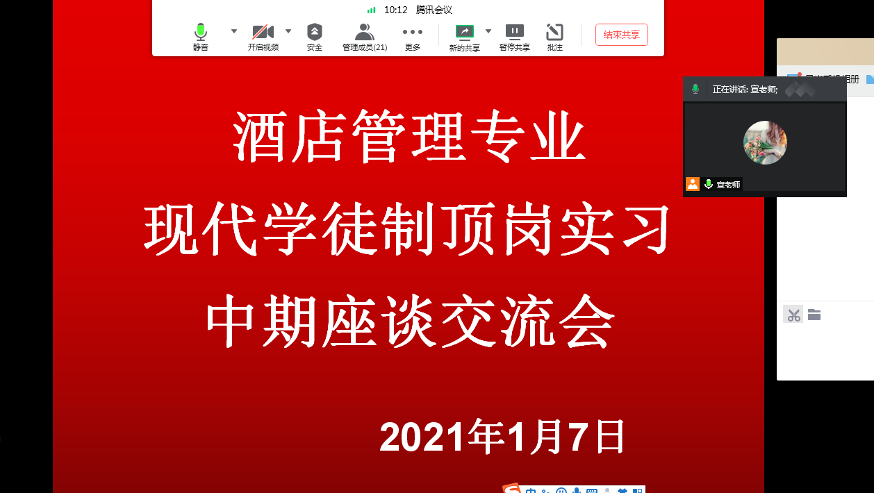 1月7日上午,经济管理学院酒店管理专业召开2018级现代学徒制顶岗实习中期线上交流活动。酒店管理教研室主任、专业负责人宣雯娟组织在成都瑞城名人酒店顶岗实习的20余名同学通过腾讯会议方式开展线上沟通交流。
