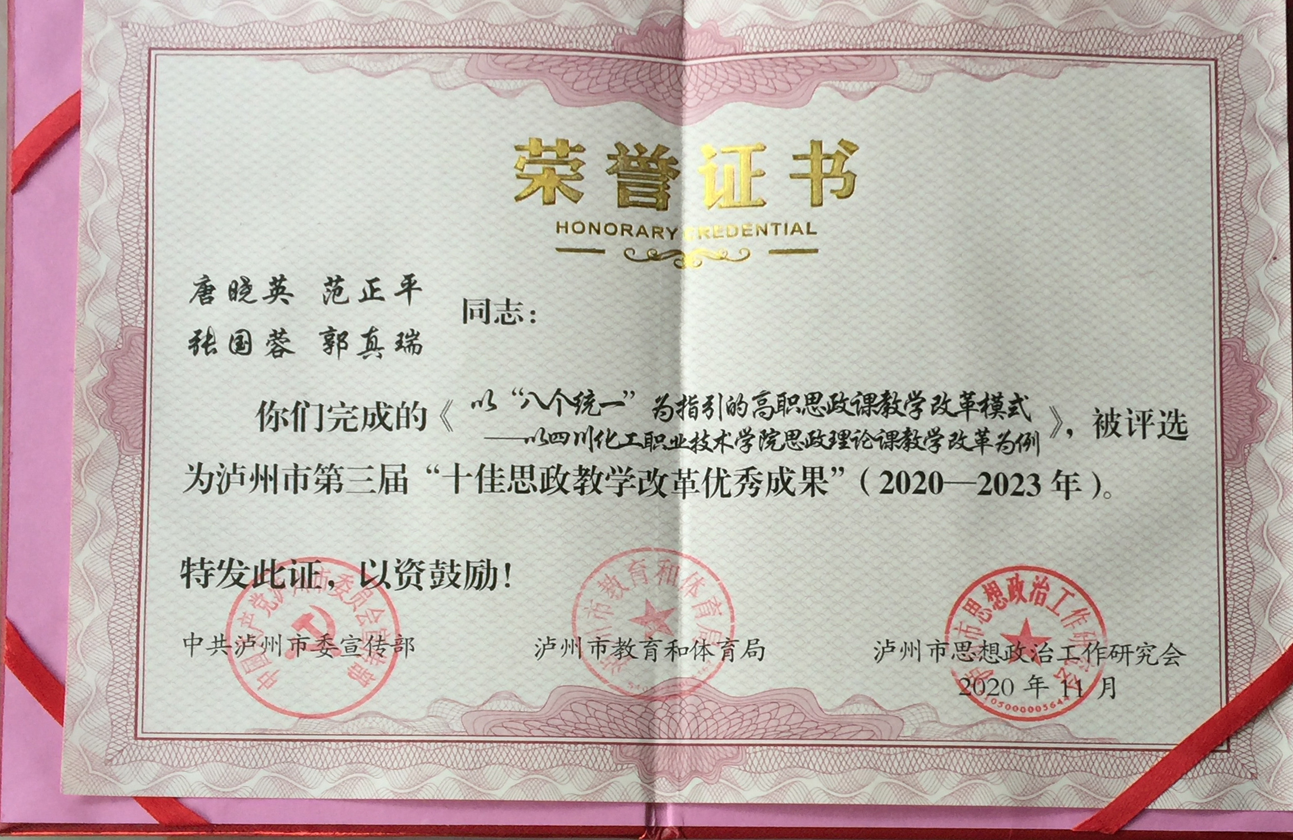 近日,由泸州市委宣传部、市教育和体育局、市思想政治工作研究会联合组织开展的泸州市第三届思政教学“双十佳”评选结果揭晓,经各驻泸高校、县区教育局推荐和初评以及专家评审和市委宣传思想工作领导小组成员评审,学校思政课教学课题组唐晓英教授负责的项目《以“八个统一”为指引的高职思政课教学改革模式——以四川化工职业技术学院思政理论课教学改革为例》荣获泸州市第三届“十佳思政教学改革优秀成果”称号。
