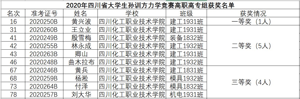 本项赛事每两年举办一次,经过赛前的周密部署和宣传,竞赛得到四川省内高校的积极响应,本届赛事共有高职高专9个院校参赛,共436名学生参赛。一等奖21人,获奖比例4.8%;二等奖30人,获奖比例6.9%;三等奖35人,获奖比例8.0%;共计86人获奖,综合获奖比例19.7% 。