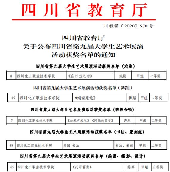 11月17日,省教育厅发布了以“奋斗·创新·奉献”为主题的四川省第九届大学生艺术展演活动获奖名单,我校在展演活动中再创佳绩,报送的艺术表演类节目和作品均获奖,其中,话剧《在日出之时》蝉联戏剧甲组一等奖、《蝴蝶泉边》获舞蹈甲组二等奖、合唱《如果有来生》《闪亮的日子》获声乐班级合唱甲组二等奖、书法作品《爱国》获书法篆刻甲组二等奖、工笔画《花开富贵》获绘画甲组三等奖,学校作为仅有的两所高职专科院校之一荣获本届艺术展演“省级优秀组织奖”。