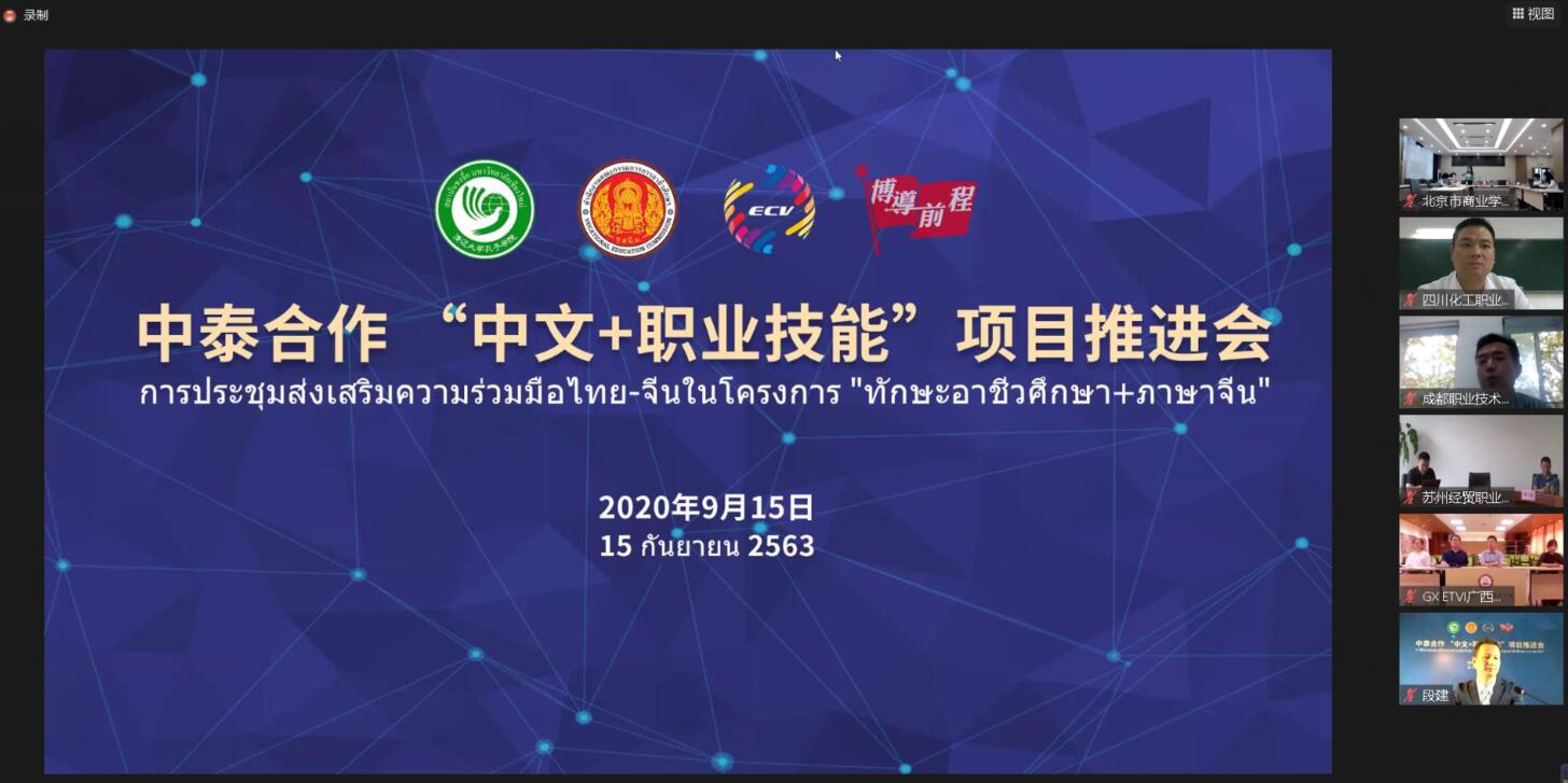 9月15日上午,由泰国教育部职教委、全国电子商务职业教育教学指导委员会(中国)、“一带一路”电商谷项目建设发展理事会、清迈大学孔子学院主办,北京博导前程信息技术股份有限公司承办的中泰合作“中文+职业技能”项目推进会在ZOOM平台举行。会议由浙江经贸职业技术学院副校长张红主持,来自中泰30多所院校代表参加了此次会议,我校经济管理学院马小洪副院长和营销专业群教研室专业教师及其他相关人员参加了会议。