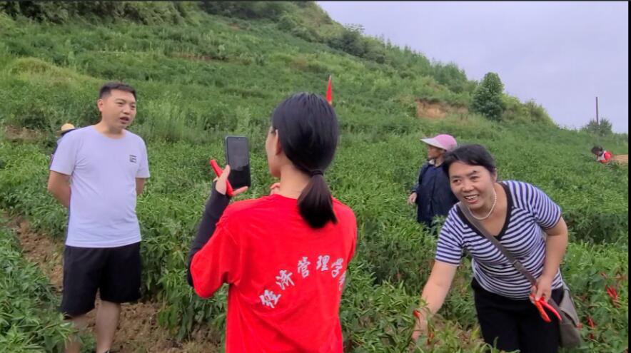 活动中,暑期社会实践小分队师生顶着烈日,积极参与到采摘辣椒的劳动中,与当地村民一起采摘鲜红的纯天然辣椒。同时,队员们分队利用自身专业知识,拍摄视频和图片收集素材,并利用经管学院抖音公众号进行了直播带货宣传,驻村第一书记牟均和致富带头人徐艳也在直播中介绍了当地辣椒的特性,更好地宣传当地的辣椒。