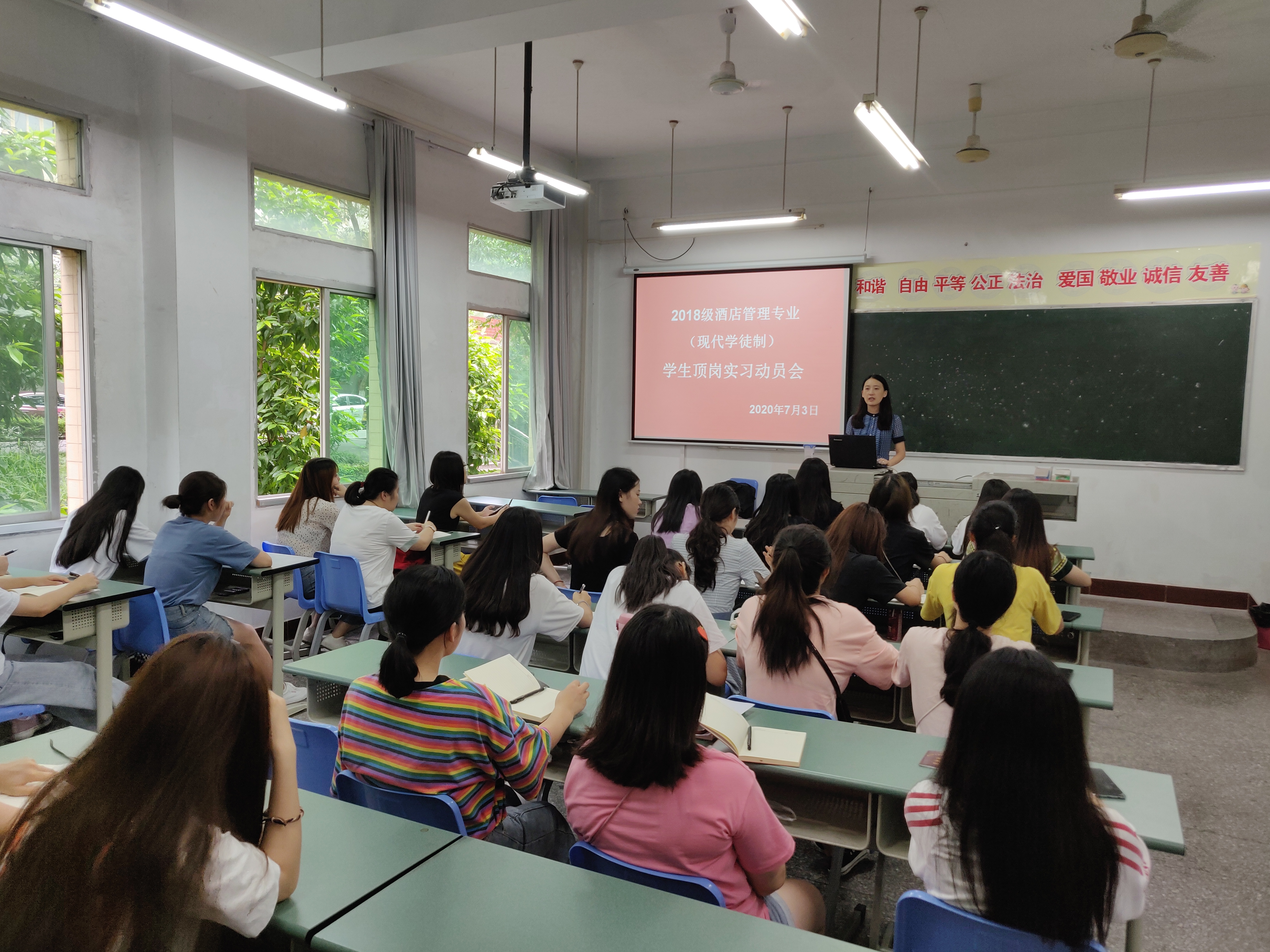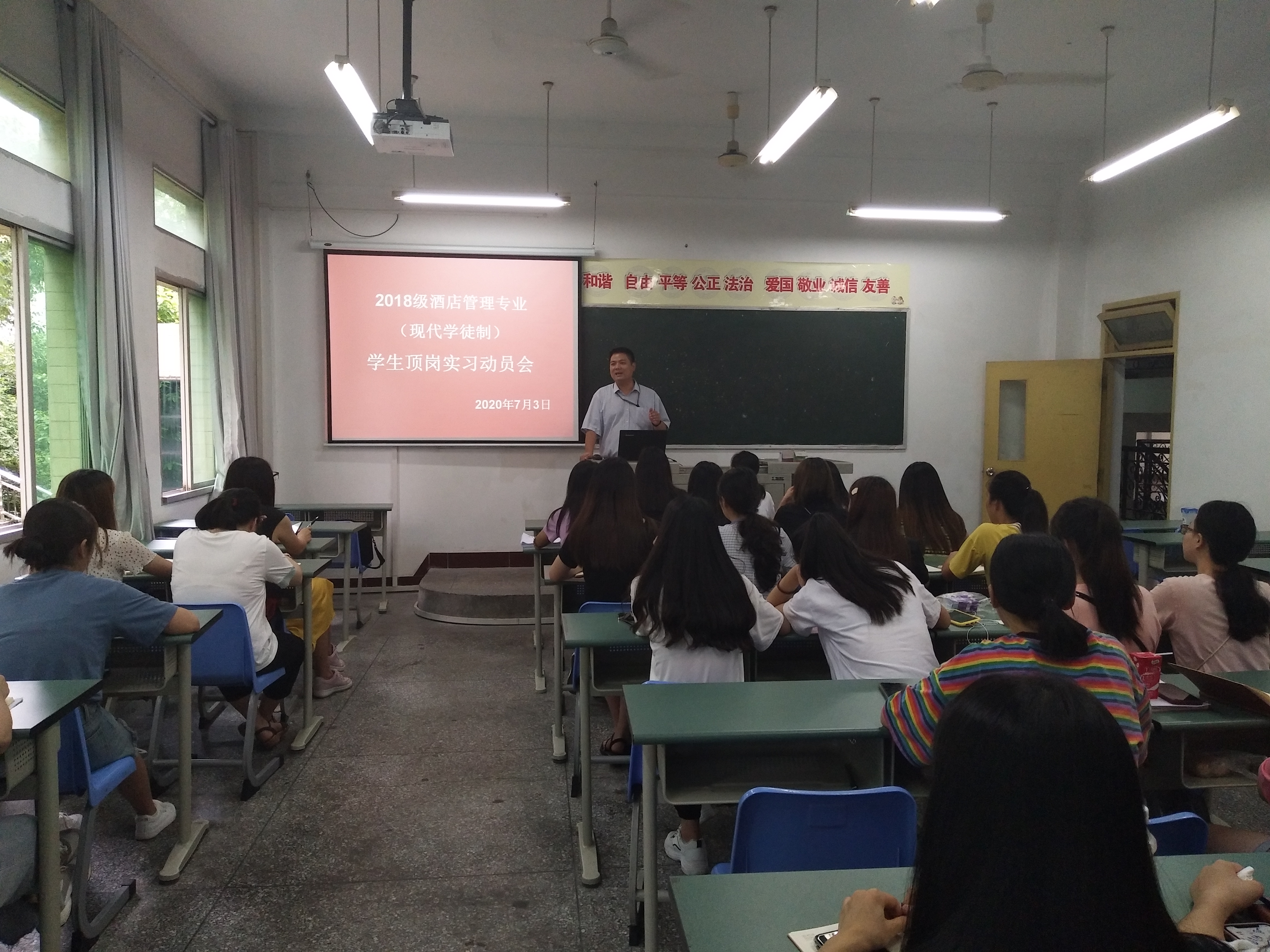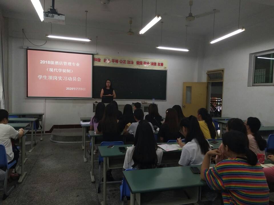 7月3日,经济管理学院2018级酒店管理专业现代学徒制顶岗实习动员大会在综A203举行。经济管理学院副院长马小洪、实习指导老师宣雯娟、酒店学徒1831班辅导员霍淑媛及2018级酒店管理现代学徒制班全体同学参加。