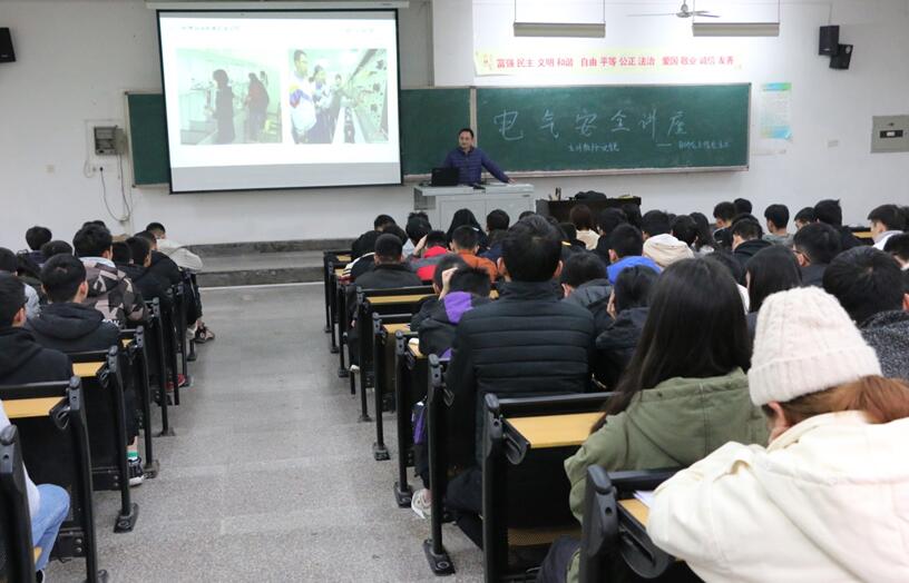 讲座中,文老师结合多年来企业和教学一线经验,给同学们详细讲解和分析了许多电气事故的实际案例,同时也给同学们提出许多期望。希望同学们扩大知识面,做到安全用电;希望同学们把自己的所学专业和社会需求相结合起来,注重实际技能的培养;告诫同学们要经常检查线路问题,避免线路破损后引发火灾等。