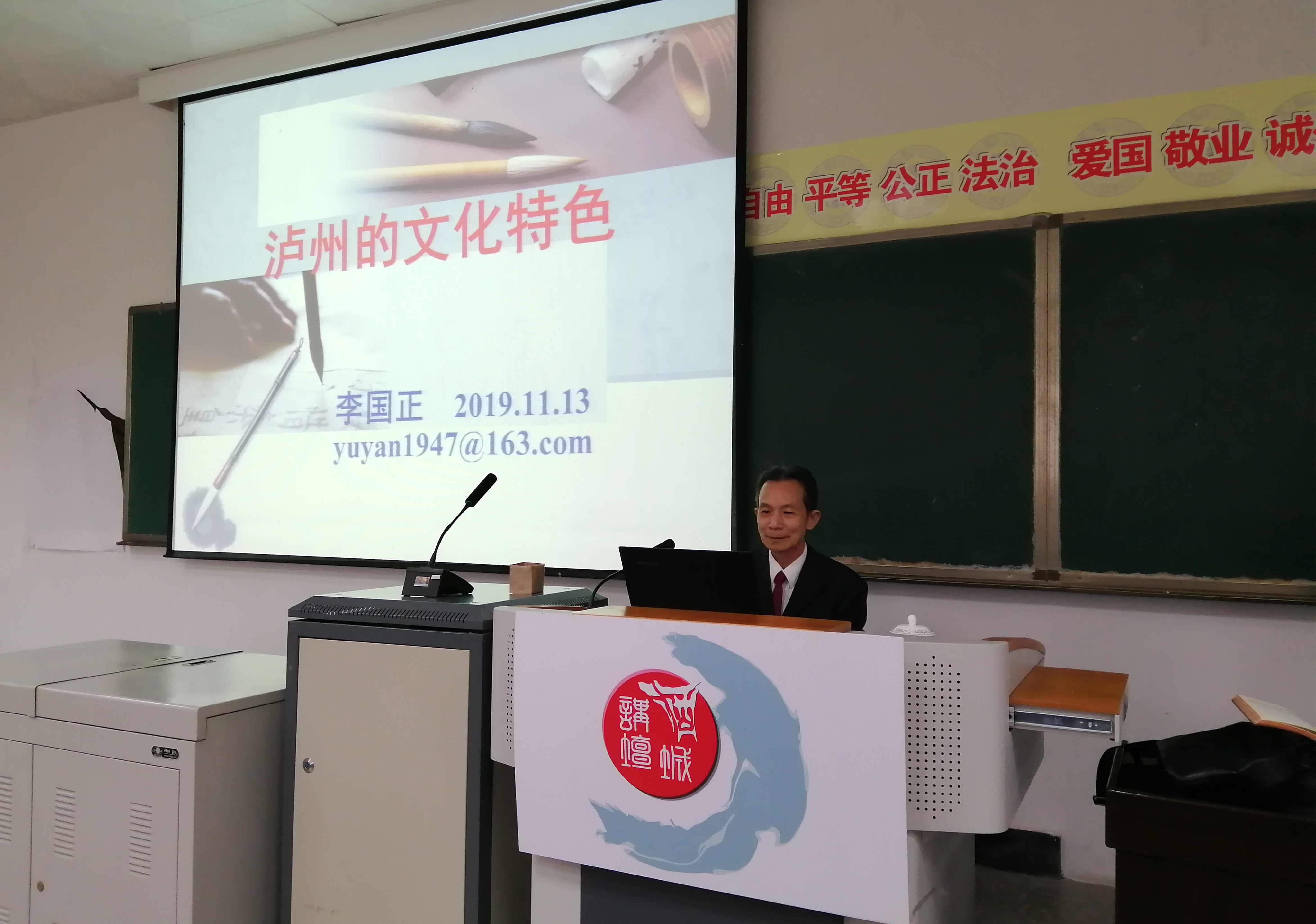 李国正教授首先从神话传说入手,即“黄帝为其子昌意娶蜀山氏之女,生子高阳,是为帝喾;封其支庶于蜀,世为侯伯,历夏、商、周。”以及历史的角度讲述了秦汉以来泸州的来历。接着他从泸州的地位、泸州的方言、泸州历史上著名的八景、泸州的古街镇、泸州的古桥坊、泸州的名产等六个方面进行了系统、全面、生动地讲述。