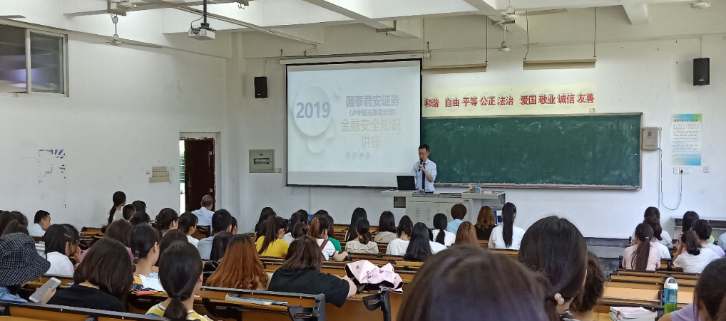 2019年6月5日下午15:00,经济管理系会计专业文化周系列活动之校外专家大讲堂在实A106举行。本次讲座邀请了国泰君安证券股份有限公司泸州星光路证券营业部的资深投资顾问江航老师来为同学们探究金融陷阱的门道,会计专业百余名同学聆听了本次讲座。