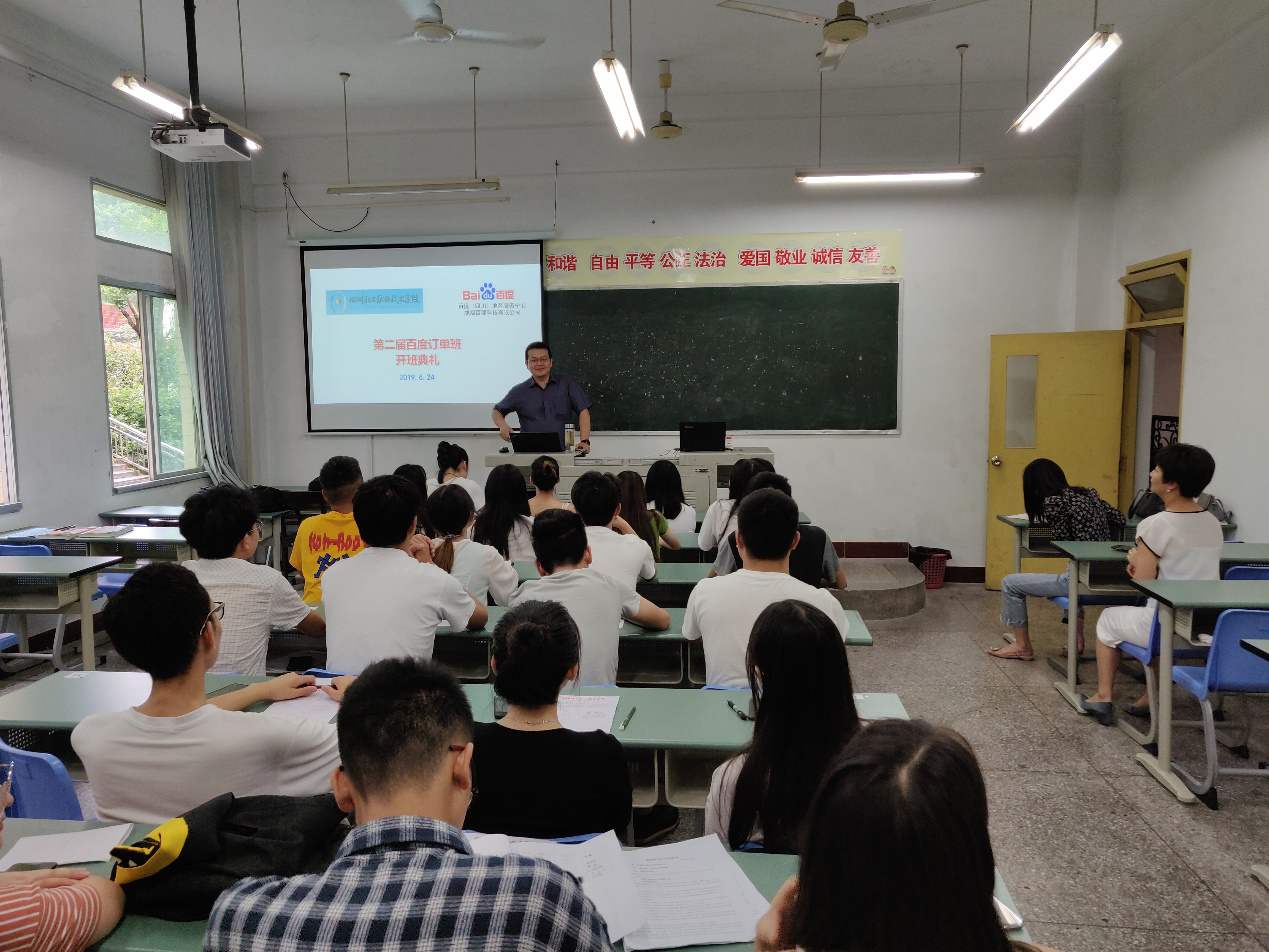 为进一步推动校企深度合作,提高人才培养质量,2019年6月24日,我校在综A203教室举行第二届“百度订单班”开班仪式。百度HRBP渠道部张保刚高级总监、经济管理系马小洪副主任、电子商务专业负责人叶永霞老师、市场营销专业负责人黄戎老师以及第二届“百度订单班”全体学员参加了仪式。仪式由经济管理系马小洪副主任主持。