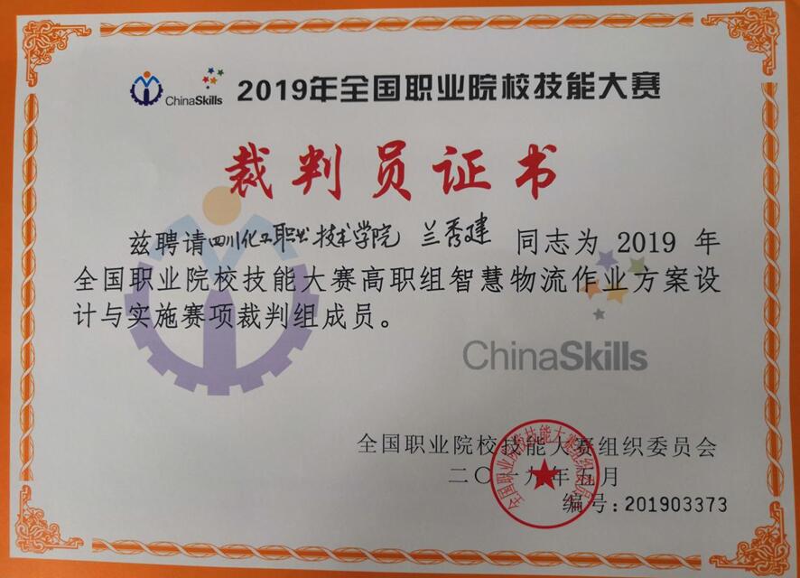 2019年5月9日,由教育部、天津市人民政府等单位联合主办的2019年全国职业院校技能大赛高职组智慧物流作业方案设计与实施赛项在天津交通职业学院隆重举行,大赛共吸引了来自全国30个省、市、自治区的61所院校、244名参赛选手参加,兰秀建老师被全国职业院校技能大赛执委会抽取并聘任为“2019年全国职业院校技能大赛高职组智慧物流作业方案设计与实施赛项”裁判,参加了裁判的培训、执裁、评分等相关工作。