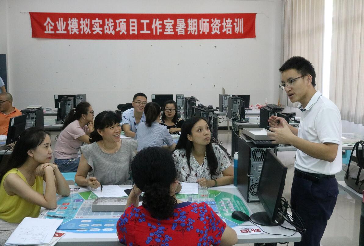 8月24日,新道科技股份有限公司王婧定助理讲师给大家进行电子沙盘模拟经营实操与训练的讲解。考虑到老师们是第一次接触电子企业沙盘模拟,王助理讲解了沙盘软件详细操作流程以及注意事项。随后老师们开始了电子企业沙盘模拟经营,公司技术团队现场进行监督和指导,老师们都非常积极的配合,学习热情高涨,现场氛围浓厚。