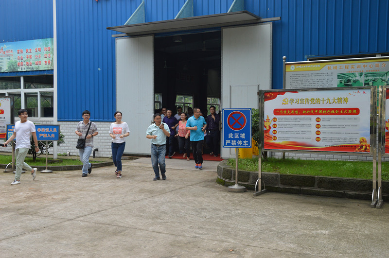 任小鸿副主任下达演练开始的命令,听到发生火情的警报后,师生员工在引导员的指引下有序从机械工程实训中心疏散到指定地点。