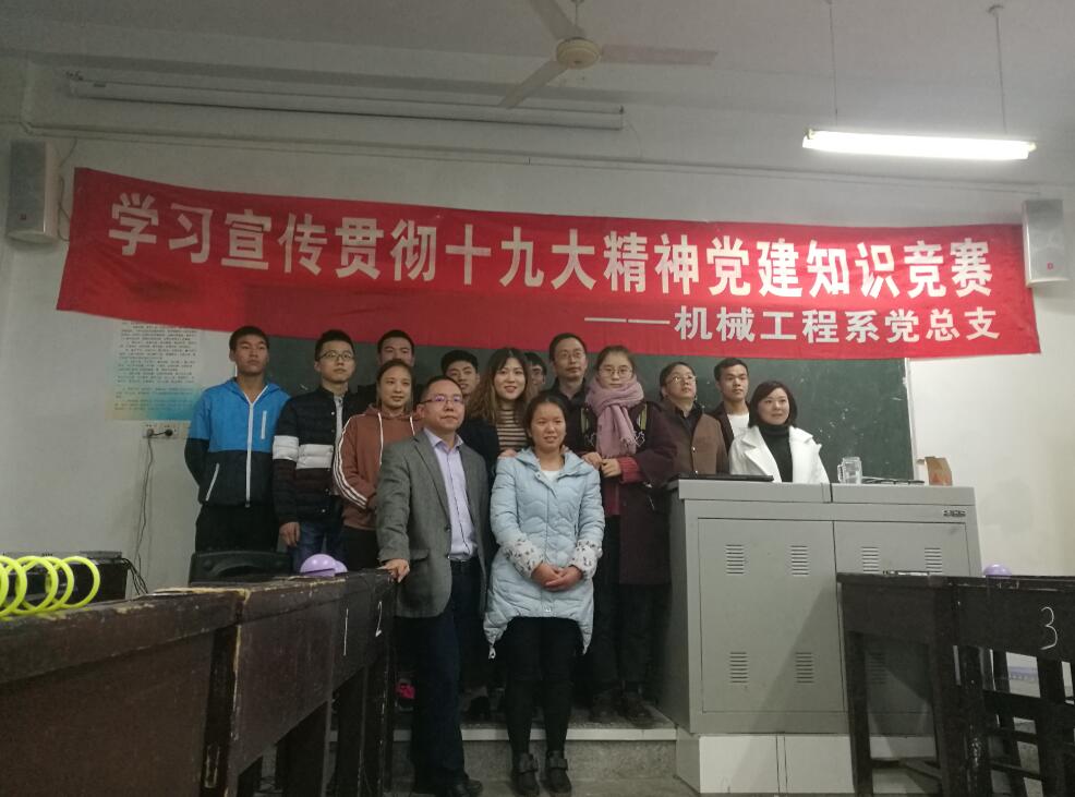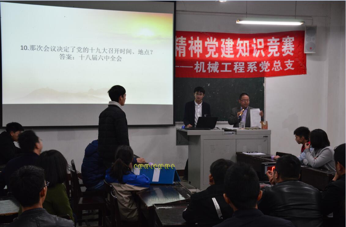 为深入学习贯彻党的十九大精神,引导广大青年学生了解党史党情, 11月30日下午,机械工程系党总支在综合教学楼A区107教室举行了“学习宣传贯彻党的十九大精神党建知识竞赛”,机械工程系主任助理张良勇老师主持比赛。