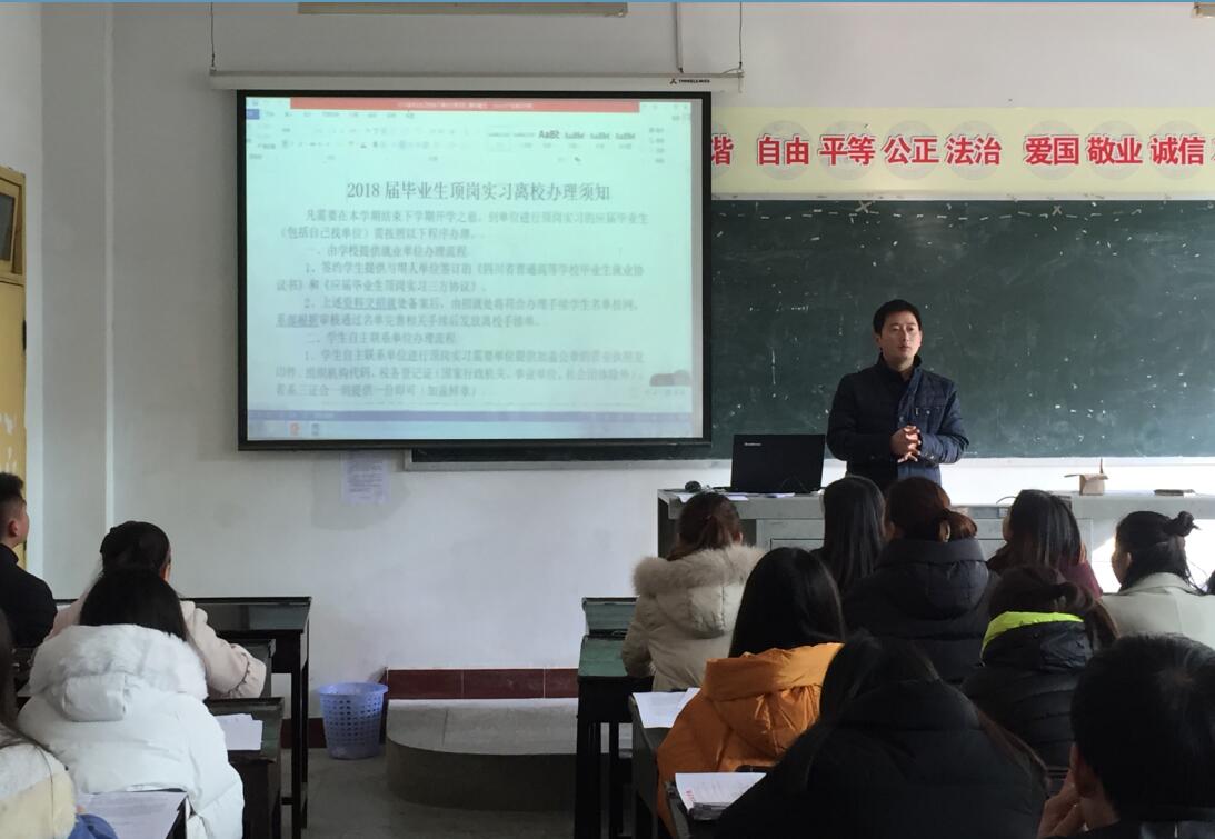 为进一步做好经济管理系2015级学生的顶岗实习工作,让学生进一步明确顶岗实习的意义,引导学生做好顶岗实习的心理准备。近日,经管系各专业分别召开了顶岗实习动员暨安全教育会,经济管理系副主任张晋、主任助理唐德兵、各专业顶岗实习指导教师和辅导员老师参加教育会。