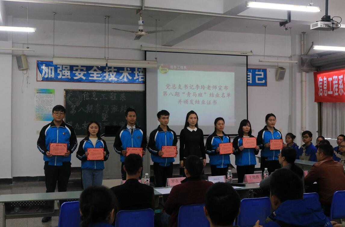 首先进行的是第八期“青马班”结业仪式:信息工程系党总支李玲书记宣布了结业名单并颁发结业证书;罗在文副主任宣布了优秀干部、优秀学员名单并颁发荣誉证书。