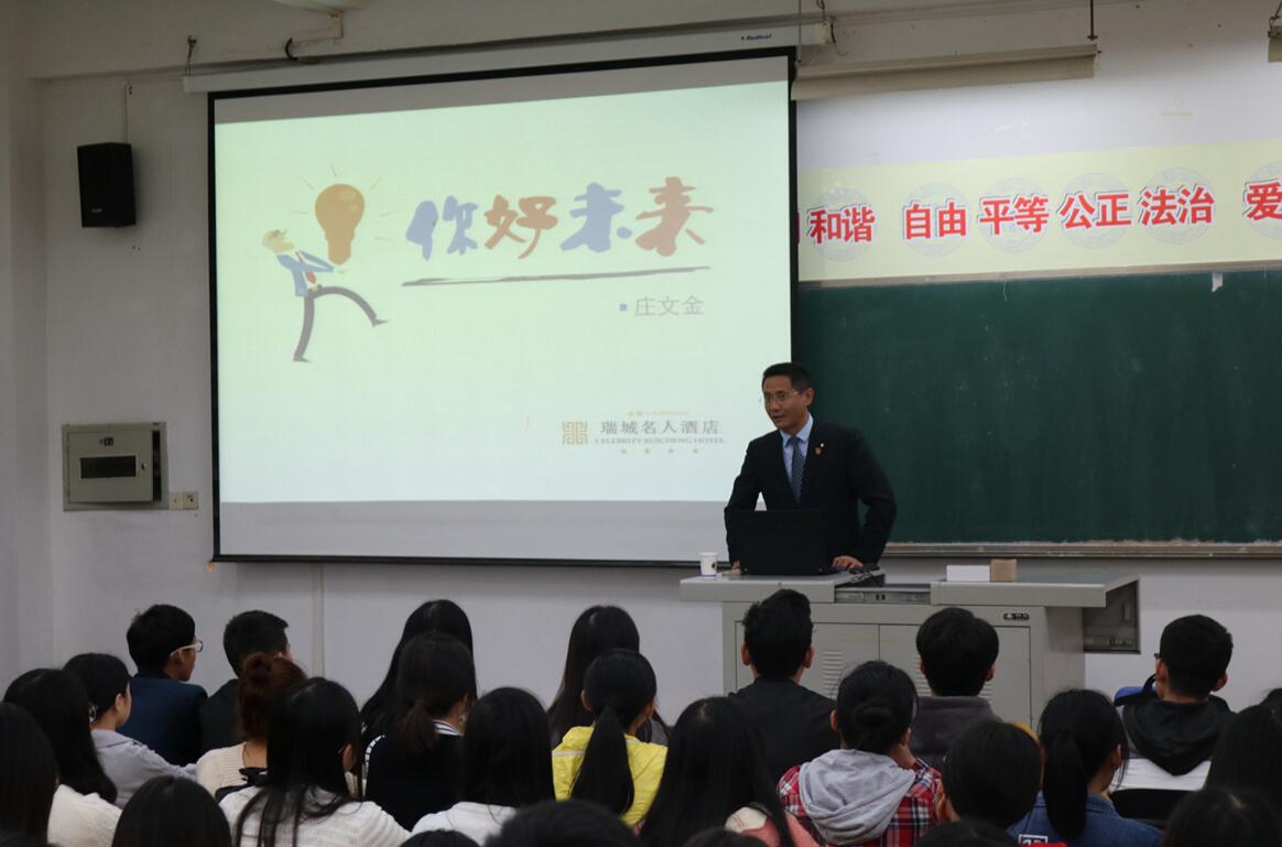 近日,学院经济管理系邀请成都瑞城名人酒店庄文金总经理在实训楼A106举办了一场以“你好未来”为主题的交流会。经管系张晋副主任、唐德兵老师及相关老师和近200名毕业生参加了交流会。