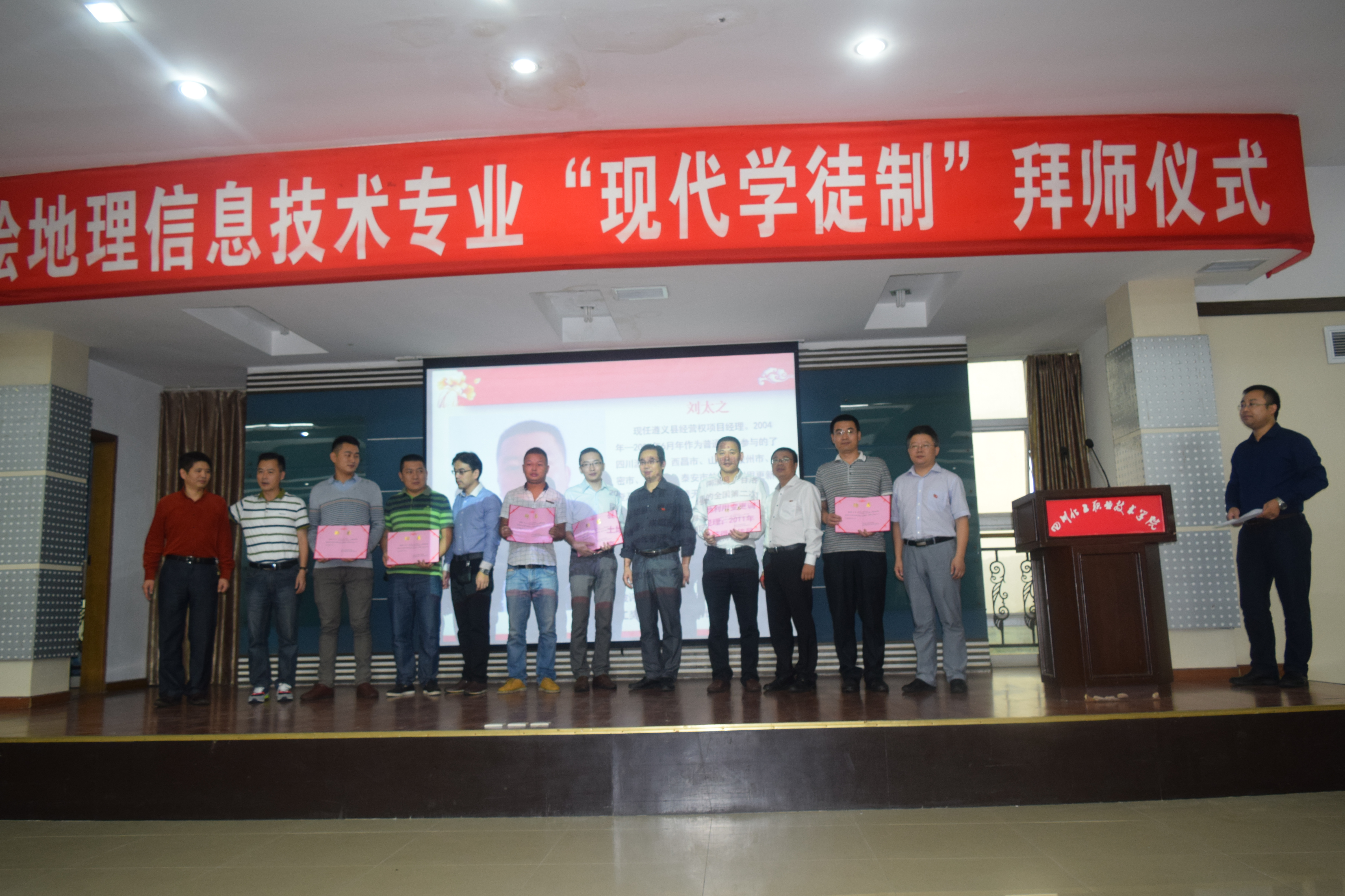 为进一步深入校企合作,近日,四川化工职业技术学院与四川空间信息产业发展有限公司在学院行政楼五楼隆重举行测绘地理信息技术专业“现代学徒制”拜师仪式。参加活动的有四川空间信息产业发展有限公司生产总监郭仕永、人力资源经理沈海娟、高级工程师荆志军和企业的10名师傅,学院副院长文申柳,院长助理邓启华,教务处、招生就业处、校企合作办公室、信息工程系的领导以及现代学徒制试点班的全体同学。拜师仪式由信息工程系党总支副书记刘钊勇主持。