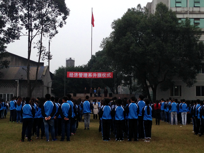 经管系学生代表作国旗下演讲。演讲体现了当代大学生的社会责任感,并庄严承诺作为经济管理系的学子,在日后的工作学习中信心百倍,求真务实,志存高远,牢记当代大学生应有的社会责任感与历史使命感!