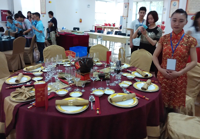 本次大赛为期三天,竞赛内容以中餐主题宴会设计为主线,涵盖台面创意设计、菜单设计、仪容仪表展示、中餐宴会摆台、餐巾折花、斟酒、现场互评、现场插花、英语口语、专业理论等内容。参赛队伍包括四川工程职业技术学院、四川交通职业技术学院、四川纺织高等专科学院等省内18所高职院校。我院酒店管理专业克服时间紧、任务重等压力,围绕“共生共荣、期待以酒”这一创意主题,展现了泸州老窖白酒文化的深刻内涵。富有地域文化特色的主题设计和参赛选手胡译丹同学沉着的表现,赢得了评委和兄弟参赛单位的好评。