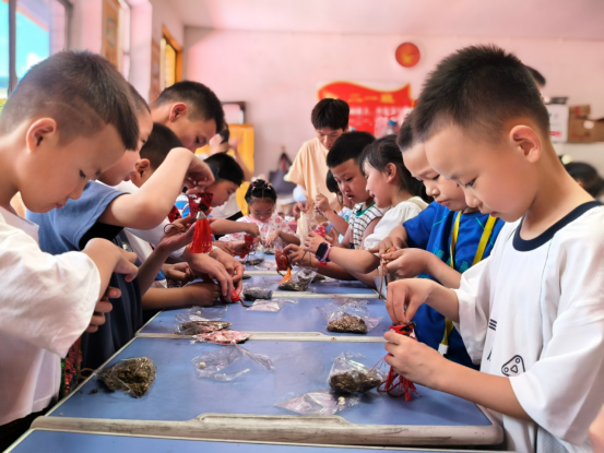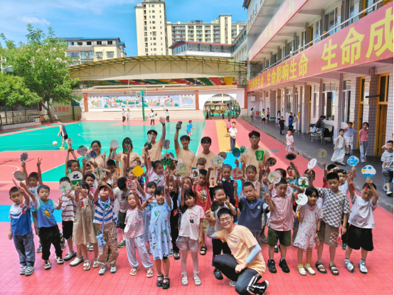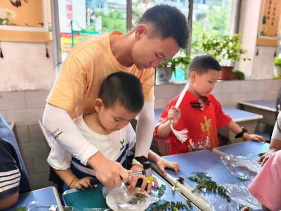 传承中华优秀传统文化,响应国家文化振兴相关政策。午后的传统手工艺实践则让孩子们触摸文化之美。团扇拓印环节中,孩子们用花草作颜料,在扇面定格自然灵韵;艾草香包制作时,一针一线缝制间,感受先民生活智慧。这些实践不仅是技艺的传承,更是文化认同的培育——当孩子们捧着自己的作品惊叹时,中华文化的深厚底蕴已悄然融入心田。