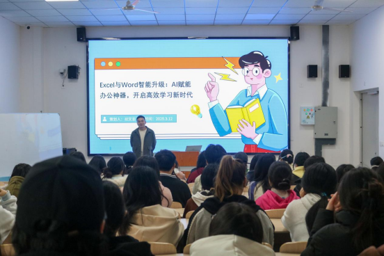 培训现场,胡老师以微软Office系列软件为载体,系统解析AI技术对传统办公模式的革新。在Word应用环节,通过智能文本分析功能现场演示文书自动排版、错别字智能纠错等实用技巧;Excel教学部分,重点讲解基于AI算法的数据建模与可视化呈现,展示动态数据透视表与趋势预测功能;结合对同学们日常使用文件的操作习惯、疑问,提出有效的解决方式,让同学们受益匪浅,对AI的多种用法有了清晰认知。
