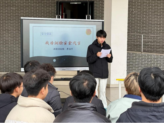 伴随着激昂的团歌声,全体师生面对团旗,共同开启了这场别开生面的安全教育之旅。测绘2332班团支书陈奕达在开幕致辞中强调了工匠精神与安全理念相结合的重要性,引领了活动的基调。在专业实操环节,同学们亲身体验了模拟的测绘作业环境,通过台上台下的互动,加深了对测绘安全重要性的理解。此外,知识竞答环节不仅考验了同学们的安全知识,还促进了团队协作能力的提升。廖治宇同学代表学生宣读了“我为测绘安全代言”的倡议书,表达了学生们对于安全的重视与承诺。最后,在全体起立宣誓环节,同学们庄重宣誓,承诺将安全理念铭记于心,并以实际行动维护生命安全,将活动推向高潮。校团委张霞书记对本次活动给予了高度评价,指出本次团日活动内容丰富、形式多样,各个环节都紧扣主题,既有趣味性,又有教育意义,真正达到了寓教于乐的效果,同时,张霞书记也指出了活动在时间管理和互动设计上的改进空间。