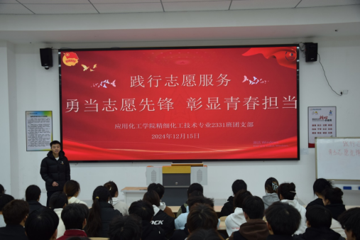 为激发我院广大青年学生的志愿服务热情,引导他们积极投身社会实践,用实际行动诠释青春的意义和价值。应用化工学院精细化工技术2331班团支部于2024年12月15日在勤学楼11A105举办了“勇当志愿先锋,彰显青春担当”沉浸式示范性团日活动,旨在深入贯彻落实志愿服务精神,激发广大青年学生的社会责任感与使命感。应用化工学院党总支副书记屈超、校团委刘羽老师、李伟老师、李大鹏老师出席本次活动,应用化工学院各班团干部现场观摩学习。