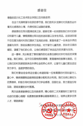 重庆市巫溪县胜利乡龙狮村支部委员会在给学校的感谢信中写道:“感谢贵校在军训圆满结束之际,能够在第一时间想到我们农村的群众和留守儿童,慷慨捐赠出军训后的迷彩服以及学生用品。这些迷彩服不仅仅是为我村村民们提供了实用的衣物,更是传递了一份来自外界的温暖与关怀;那些实惠的学生用品,对于留守儿童而言,犹如冬日里的暖阳,温暖了他们的心田,让他们感受到了来自远方的关爱与支持。