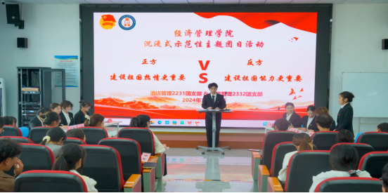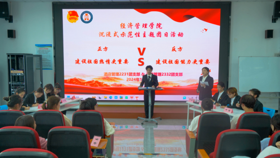 为深入学习贯彻习近平总书记关于弘扬爱国主义精神的重要论述,引导广大团员和青年坚守初心使命、激扬家国情怀。2024年10月14日,经济管理学院在醇雅楼102开展“厚植家国情怀——青春告白祖国” 沉浸式示范性主题团日活动,本次活动由酒店2231团支部和酒店2332班团支部联合开展,活动内容主要以辩论赛的形式呈现。校团委副书记(主持工作)张霞老师、校团委李大鹏老师、刘羽老师及各二级学院团总支书记亲临现场指导,经济管理学院各班团干部到场观摩学习。