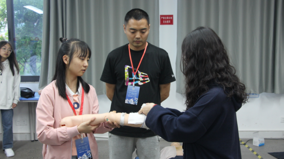 创伤包扎是外伤现场应急处理的重要措施之一,能够有效地预防伤口感染,指导教师讲解了创伤包扎在灾害救援中的重要性,并详细演示了不同部位的包扎方法:八字包扎法、螺旋反折法、环形包扎法等。